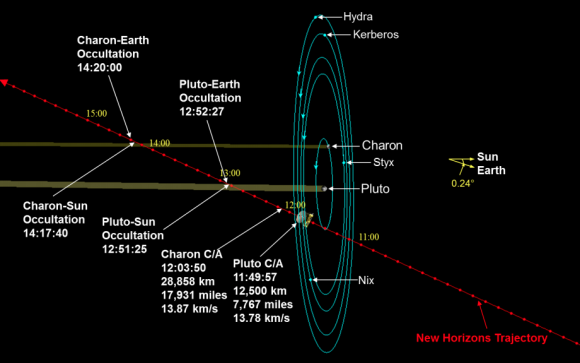 Paradójicamente, será en pleno verano cuando los (tataranietos)^n de aquellos que bautizaron la mitología veamos como una sonda espacial lanzada hace casi una década atraviesa el complejo sistema binario que forman el planeta enano Plutón y su mayor luna Caronte, bordeando el caos en el que se desplazan Nix, Hidra, Estigia y Cerbero. Como casi siempre ha sucedido con las misiones espaciales, los costes eran quizá mayores escollos que el propio viaje (igual me he pasado…). Por eso, la misión que hoy se vanagloria de haber llegado a Plutón, tiene una tremebunda historia detrás de aproximadamente 20 años en los que tras varios notables cambios (gracias @Eurekablog) en los pesos, los objetivos, los métodos e incluso el nombre de la misión -por citar algunos- finalmente lanzó la sonda en 2006 y en casi 9 años y medio (que hubieran sido 3 más sin la ayuda gravitacional de Júpiter) tendremos la oportunidad de ver desde 12.500 kms. el planeta que Clyde W. Tombaugh descubrió aquel 18 de febrero de 1.930. Ni siquiera se han completado los 248 años de la excéntrica e inclinada órbita plutoniana desde aquel día, durante unos 20 de los cuáles está más cerca del Sol que Neptuno, tras cruzar sus caminos en la inmensidad del Espacio.