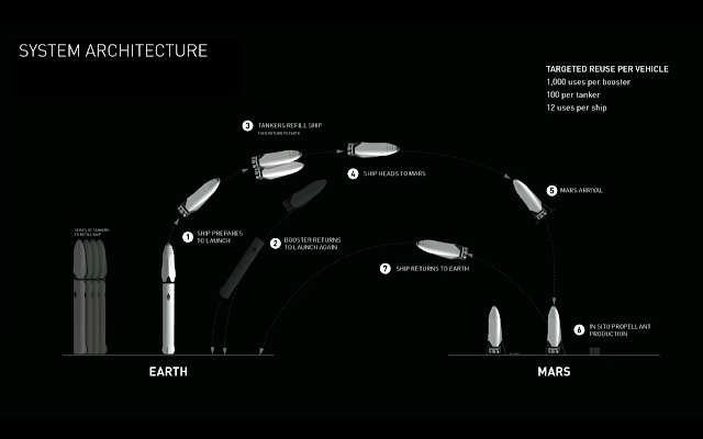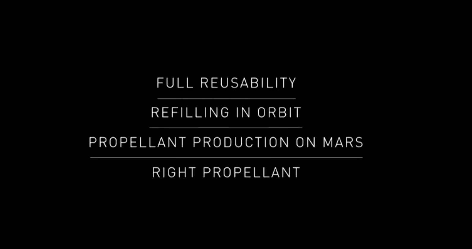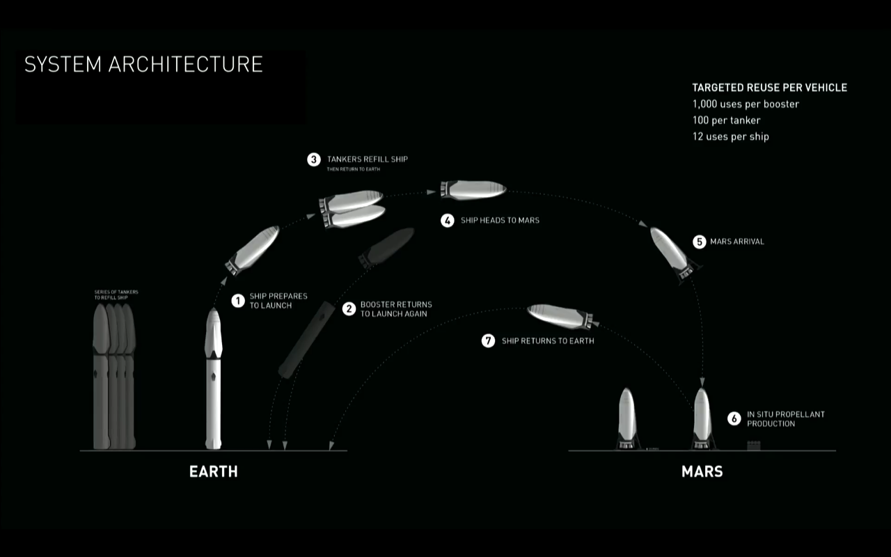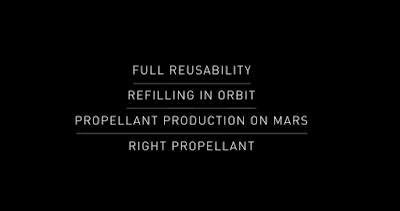 De entrada, el sheriff de SpaceX dejó claro que lo que ellos han definido son los que consideran cuatro pilares fundamentales que debería abordar una misión de estas características, y también dejó claro que no tienen por qué ser ellos los primeros que la lleven a cabo con un “bueno, nosotros, o quien sea que lo intente”. A saber: la reutilización de las partes principales, el repostaje en vuelo, la producción de combustible en Marte para poder volver y que la elección del tipo de combustible sea la adecuada. Sobre eso entró después en detalles.