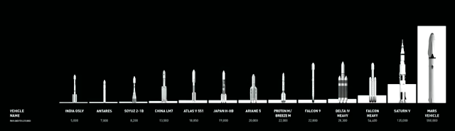 En blanco la eficiencia de cada uno de los cohetes. Para la misión a Marte,