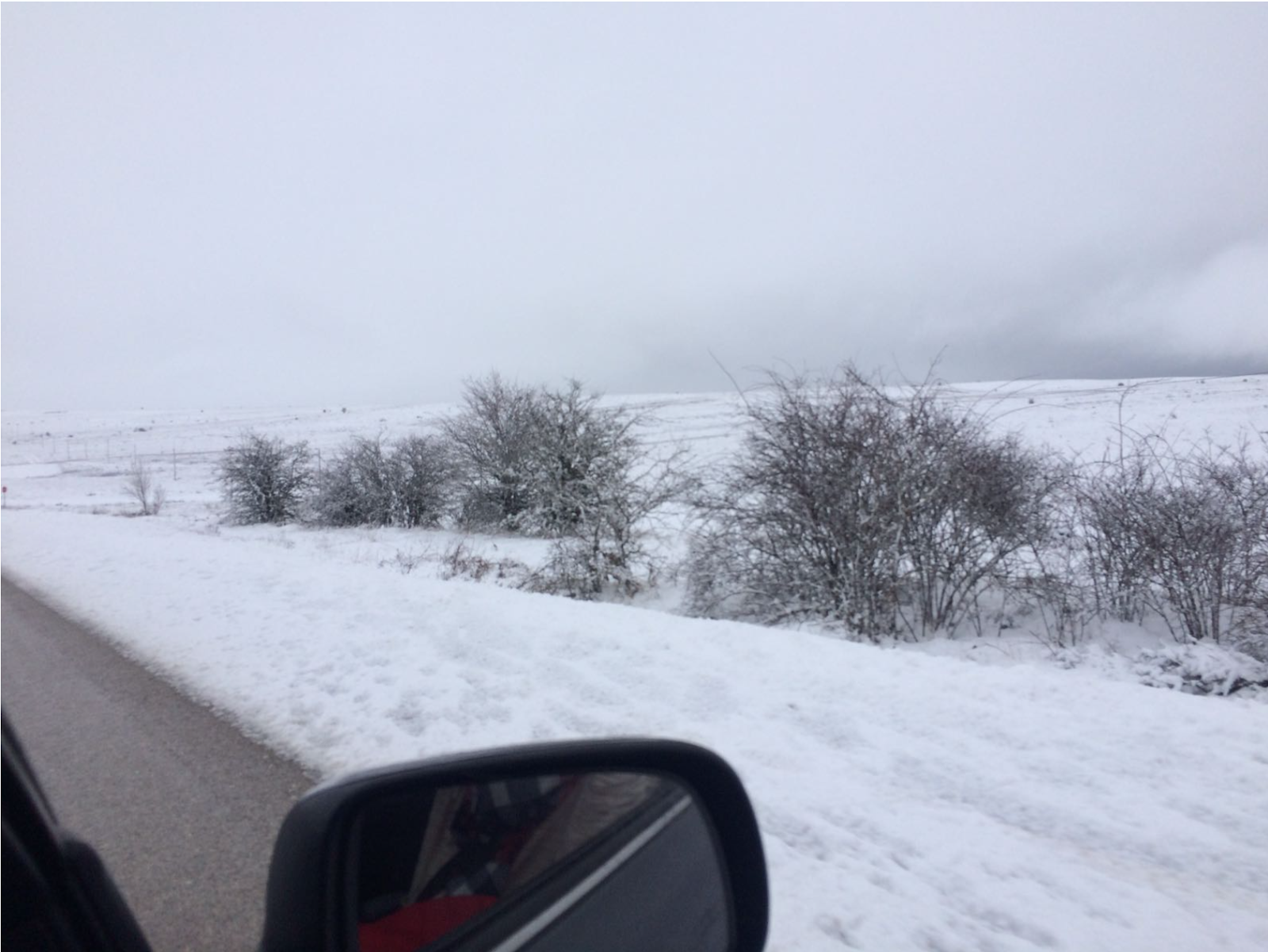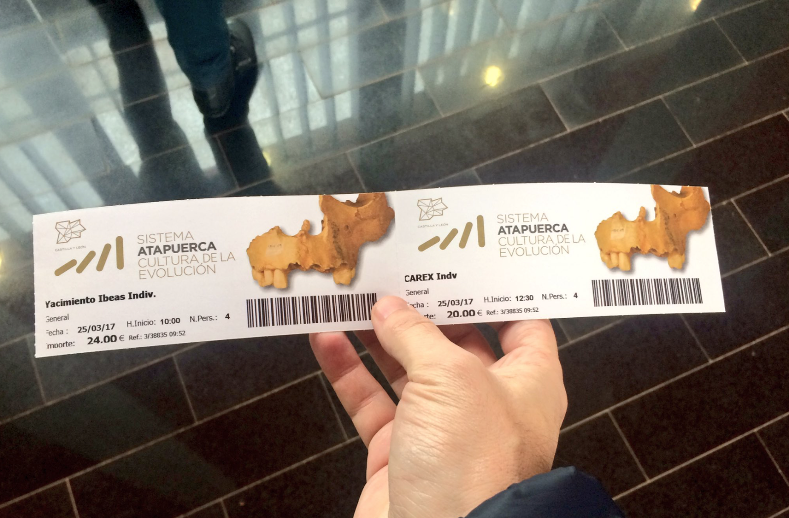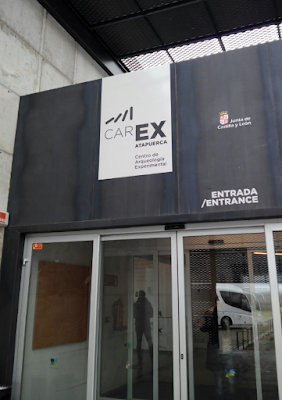 Salimos del pueblo a las 7:55h con lluvia, y sin excesivo frío. El objetivo era estar en el Centro de Acceso a los Yacimientos (CAYAC) de Ibeas de Juarros a las 9:45h. Agradezco desde aquí a Vredestein la patente de los neumáticos de invierno, porque de no ser por ellos probablemente hoy no podría escribir este post. Así, como suena. La nevada que nos pilló a mitad de camino no impidió que la velocidad no bajase de los 80 km/h. Aparcamos en Ibeas a las 9:47h… prueba superada. Un edificio moderno, con una suerte de millario nos indica que estábamos en el lugar correcto. On time. Confirmamos que nos esperan, y subimos al autobús que nos llevará a la Trinchera del Ferrocarril. La sierra de Atapuerca, por cierto, no es más que dos lomas elevadas apenas 80 m. sobre la superficie del propio CAYAC.