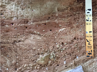 En la última parada, la Gran Dolina, nos explica cómo consiguieron datar los restos a partir del estrato donde está reflejada la inversión magnética Bruhnes-Matuyama. Esto es, cuando la polaridad de la Tierra cambió por última vez, hace ahora unos 780.000 años. Interesante historia sobre cómo se demostró que así fue… e inquietante lo que pasaría si hoy tuviera lugar una reversión como aquella. Se han desenterrado elementos de diversísimos animales herbívoros y carnívoros, aunque de momento no ha aparecido ningún homínido, las herramientas encontradas son también de los Modos 1 y 3, y la antigüedad data entre 500.000 y 300.000 años. La ubicación de esta zona en la trinchera nos hizo sufrir los soplidos de Eolo, aunque aguantamos estoicamente gracias a los chistes con los que David interactúa con los visitantes.