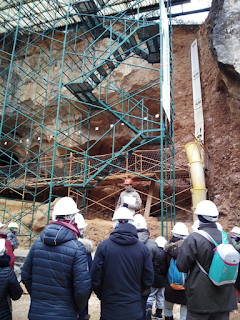 La Trinchera del Ferrocarril tiene tres paradas. Durante principios del siglo XX, unas voladuras en la piedra caliza dejaron al descubierto ese tesoro paleoantropoarqueológico. Conviene recordar que mucha gente piensa que los yacimientos están continuamente siendo excavados, pero la realidad es bien distinta. Más aún en Atapuerca. Estamos hablando de decenas de miles de restos ya extraídos, y quién sabe cuantos por extraer. Por esa inusual particularidad, los científicos tan sólo excavan durante un mes y pico al año, y se pasan el resto del año en el laboratorio analizando lo encontrado. Muestras, informes, hipótesis, confirmaciones… nada que ver con Indiana Jones y su camisa resudada corriendo delante de una bola de piedra gigante. A día de hoy, casi 300 personas al año entre becas, doctorandos y científicos con experiencia dedican su esfuerzo a buscar restos que sigan asombrando al mundo, literalmente hablando. Como buena trinchera, espero que no tengáis la suerte de que nieve y haga viento y frío. Aprendimos un montón, pero de 365 días que tiene el año, digamos que a lo mejor podíamos haber disfrutado más. No me extenderé en la explicación de David en cada una de las tres «estaciones» para que lo descubráis por vosotros mismos si tenéis la oportunidad de visitarlo.