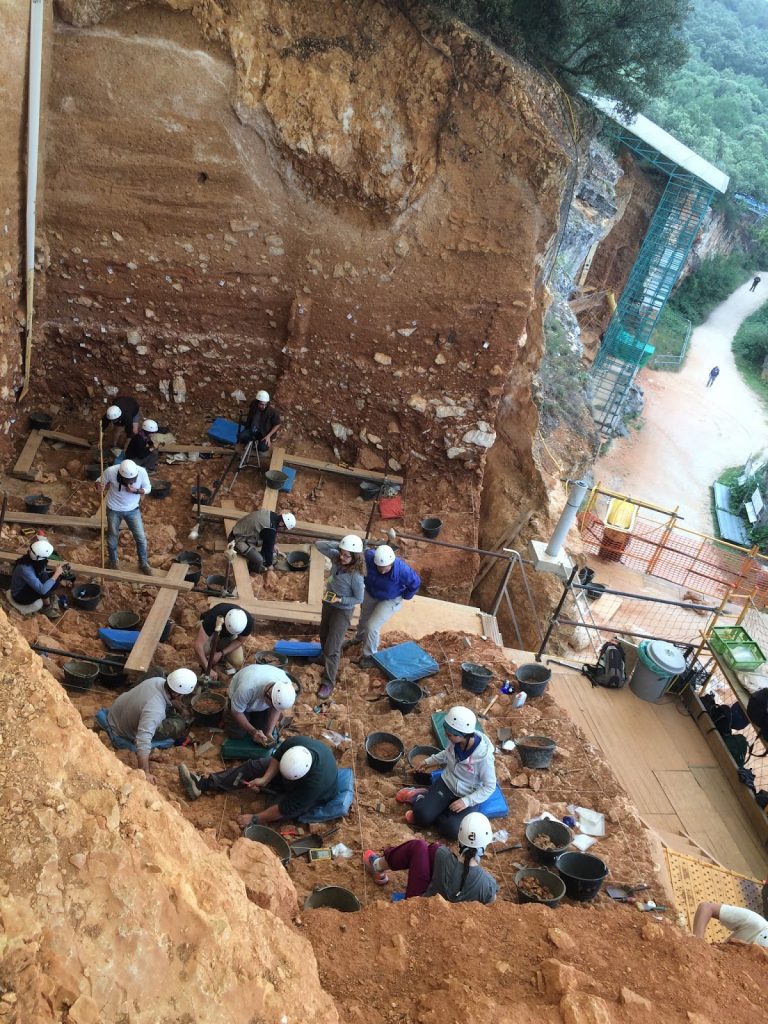 Andreu nos cuenta que en la parte alta de Gran Dolina, «el ático», se trabaja sobre sedimentos más recientes que abajo. Unos 400 mil años. Esa zona de unos 85 m2 la trata un equipo de 22 a 25 personas. Se trata de una enorme grieta, entrada a una gran cueva en el interior de la montaña. En esta parte se encuentran los vestigios de lo que hacían en su día a día los cazadores-recolectores: cazaban, procesaban los animales (cortar, desmembrar, etc…) y abandonaban los restos.