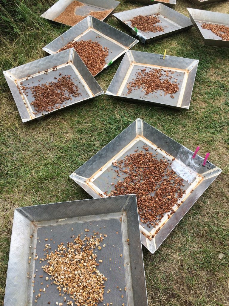 Hay que dejar la zona de los yacimientos para llegar y atravesar callejeando el pueblo de Ibeas de Juarros donde nos espera Gloria. Junto al río nos recibe un conjunto de carpas, un montón de sacos -recién traídos desde los yacimientos- en cuadrantes, unas mesas y el suelo plagado de cribas con las que se batean los restos. Y dentro de él, una estructura con varios tubos a modo de manguera recibe el agua desde una motobomba y el hueco para alojar las cubas metálicas rellenas con la tierra de los sacos. La presión del agua solo deja restos suficientemente sólidos y grandes que son secados en las cribas, para posteriormente ser cuidadosamente inspeccionados. Los pequeños restos encontrados son clasificados de manera que se sepa exactamente de qué punto de la sierra provienen. Trabajo de chinos, que nos sorprende ver haciendo a un chaval que está de vacaciones en el pueblo: Alejandro, de 16 años. Su madre hizo esta misma visita y preguntó a Gloria si podía ayudar a descubrir fósiles. Sorprendentemente, es probable que Alejandro sepa más de fósiles de microfauna del Pleistoceno que su profesor de biología y geología. Ahí está, utensilios en mano, separando lo que son piedritas de lo que son microfósiles de vertebrados (anfibios, reptiles, peces, aves y mamíferos).