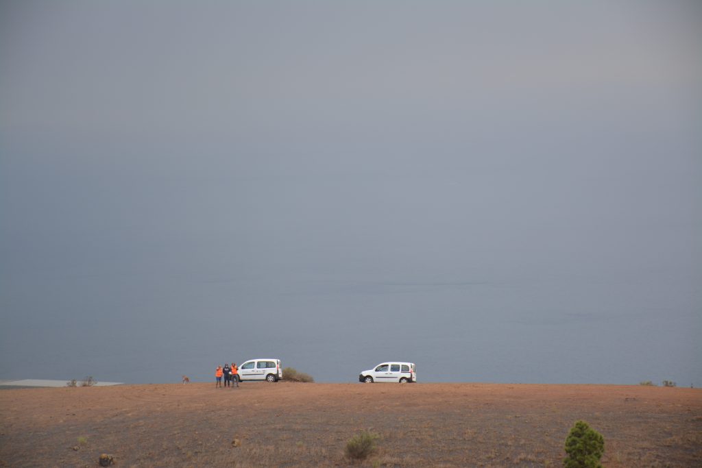 Son las 16:05h. Las guaguas siguen el camino que uno de los vehículos policiales les marca. Unos minutos de circulación por la carretera general y el convoy llega al punto de control. Se entra en la “Zona de Exclusión”. A partir de ese momento el panorama es desolador. Un callejeo verdaderamente complicado entre calles desiertas que recordaban los tiempos no tan lejanos de confinamiento, viviendas vacías y plantaciones de plátanos hasta llegar al desvío para subir a la montaña de La Laguna. En toda su ladera apenas hay rastro de vegetación. El terreno se va haciendo cada vez más irregular a medida que se asciende y, para más inri, el conductor interpreta mal la seña de la Guardia Civil y comienza a subir por un terreno realmente escarpado a una zona a la que no había que ir, algo que sonsaca algún que otro comentario entre jocoso y desconfiado de los que van dentro. Un poco de confusión y un par de gritos por parte de los responsables meten a todo el mundo a los vehículos para bajar al lugar correcto: «¡Que no es aquí! Vamos, venga». Ahora sí. Se desciende de los vehículos sin prisa porque, efectivamente, la explanada es enorme. Un podenco observa plácidamente como cada equipo se coloca en su sitio y los clics de los fotógrafos ametrallan la escena rastreando lo diferente en aquella tremenda desolación que parece toda igual frente a sus ojos.