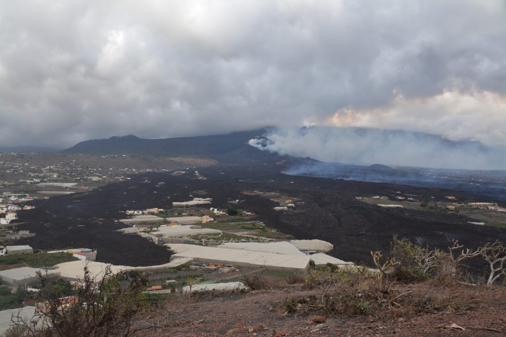 Desde ese punto se ve el penacho blanco y negro y las coladas que durante meses tuvieron en vilo a los palmeros. Casas, plantaciones, carreteras, negocios pequeños o la famosa sucursal bancaria que engulló la lava. La colada no hace distinciones en su camino hacia el océano, y la fuerza de la gravedad terrestre la ayuda irremediablemente. La misma fuerza que la lava hacía no mucho había tenido que vencer para salir de las entrañas de nuestro planeta. La vista panorámica permite ver en tiempo real ese avance. Va todo tan rápido que basta que alguien comente “mira, va despacio, pero se va a tragar ese invernadero” para que unos cuantos cambien su enfoque y dejen por un momento el cono del volcán para fijarse en esa lengua naranja y negra.