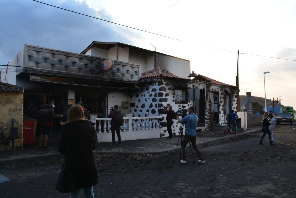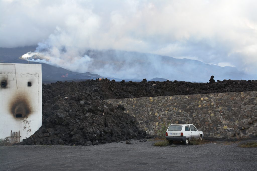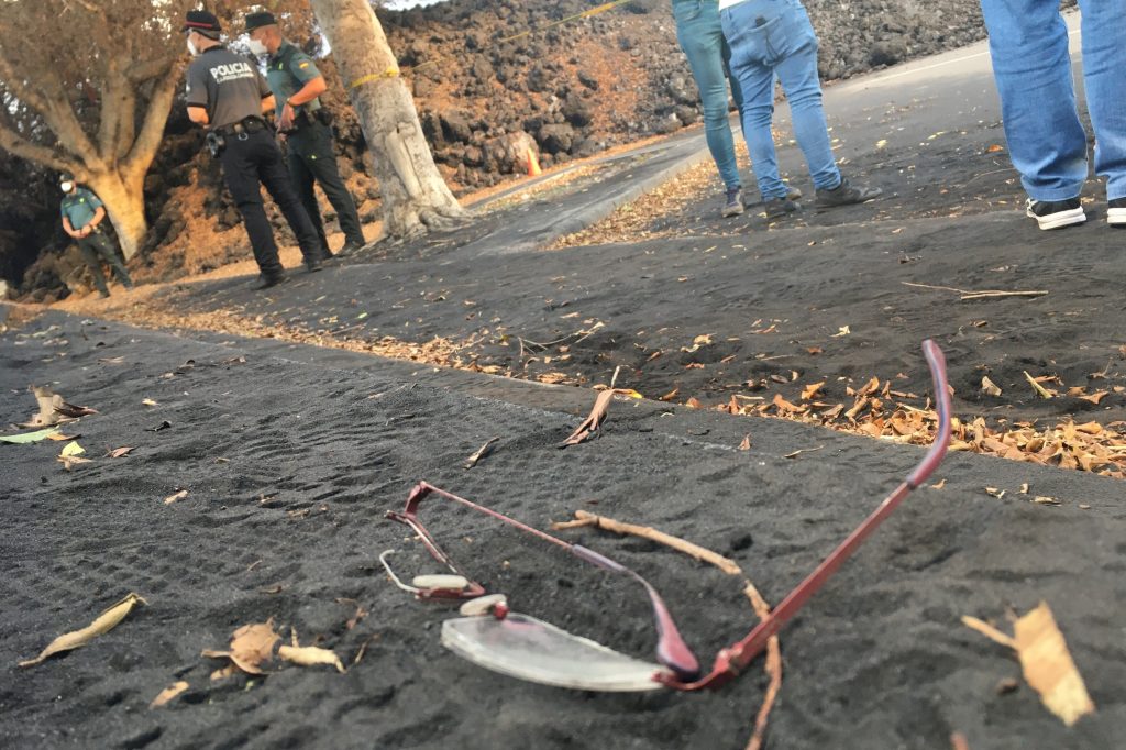 No es un trayecto largo hasta la siguiente parada. La zona de la iglesia de La Laguna es dantesca, un escenario apocalíptico. El impacto de ver la altura de una de las coladas más antiguas de la erupción es todavía mayor cuando los miembros de INVOLCAN te dicen que hay coladas de unos 30m. de altura, por referencia, como un edificio de 10 pisos. El director del plan PEVOLCA aparece minutos después para responder a lo que le quieran preguntar. Las casas vacías, engullidas por el fuego hace unas semanas, el bar Central y sus bocadillos, el ya famoso Seat Panda junto a la colada, incluso unas gafas rotas en las escaleras que parecen esperar un final algo más digno… que no llegará, al menos de momento. Todas esas cosas son a la vez la prueba evidente de la velocidad con la que sucedieron los acontecimientos durante un desalojo que debió ser tan rápido como dramático y la de cómo se paró el tiempo. En arqueología se le llama “posición primaria”, el lugar en el que las cosas aparecen dispuestas en el terreno como quedaron durante el abandono del lugar en cuestión. Algunos se saltan la premisa inicial de no acercarse a los edificios y son recriminados por los efectivos de la Guardia Civil. No están para bromas. No quieren más problemas de los que ya tienen.