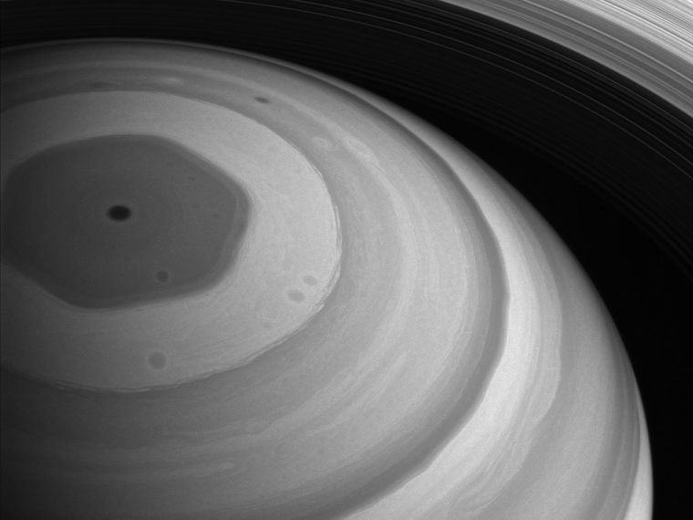 A escalas gigantescas, pocas cosas más enormes y misteriosas que la tormenta hexagonal del polo norte de Saturno. Una bestia de 3.000 km de anchura que gira sin contemplaciones en el sentido de las agujas del reloj a velocidades inconcebibles aquí en la Tierra, con vientos de hasta 500 km/h. La sonda Cassini fotografío esta fenomenal representación hexagonal extraterrestre en las pasadas que hizo sobre ella durante su Grand Finale. En intervalos de 6 horas la tormenta rota el doble de rápido de lo que lo hace el planeta sobre sí mismo. Un vórtice como ese ocuparía un espacio en la Tierra equivalente a la distancia entre Madrid y Varsovia, por ponerlo en perspectiva. El ojo es unas 50 veces más grandes que lo que suele ser de media el de un huracán terrestre. Casi nada… y es que Saturno es mucho más que sus anillos. Incluso este concepto me llevó a hacer un diseño sobre la tormenta hexagonal para @nabla_diffwear que puedes encontrar aquí.